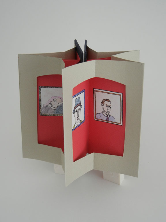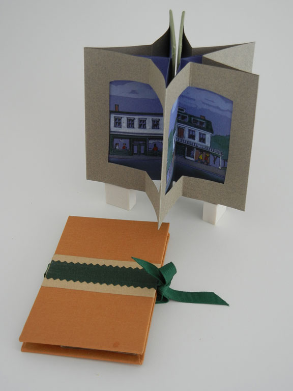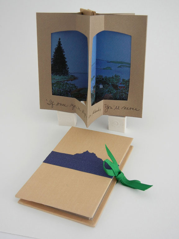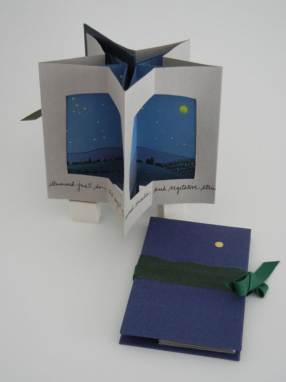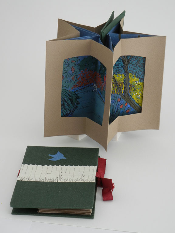The name of this book structure derives from the fact that when opened, if you look down on the book, it looks like a star. To develop these, the drawn outlines of the images are printed onto sheets of paper and then hand colored. On those books that include a quote it is written by hand on the front of the frames that enclose the images. Completed books are 5"h x 3"w and are closed with a ribbon.