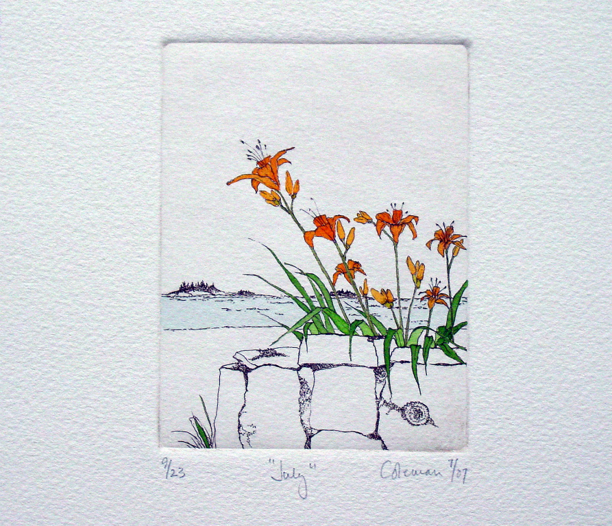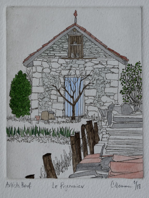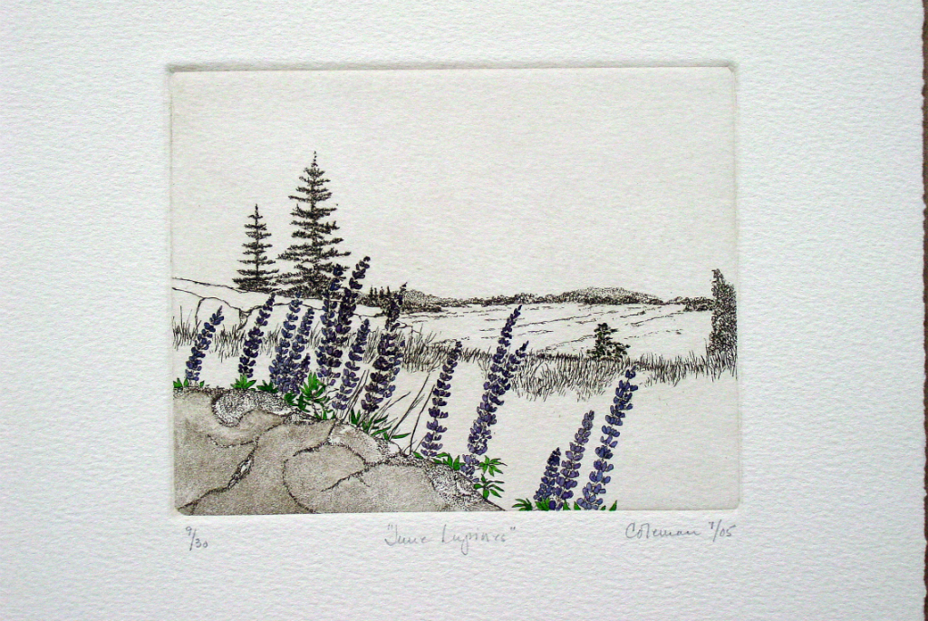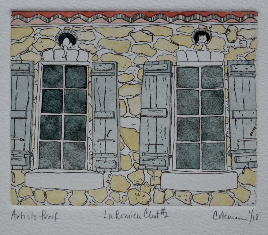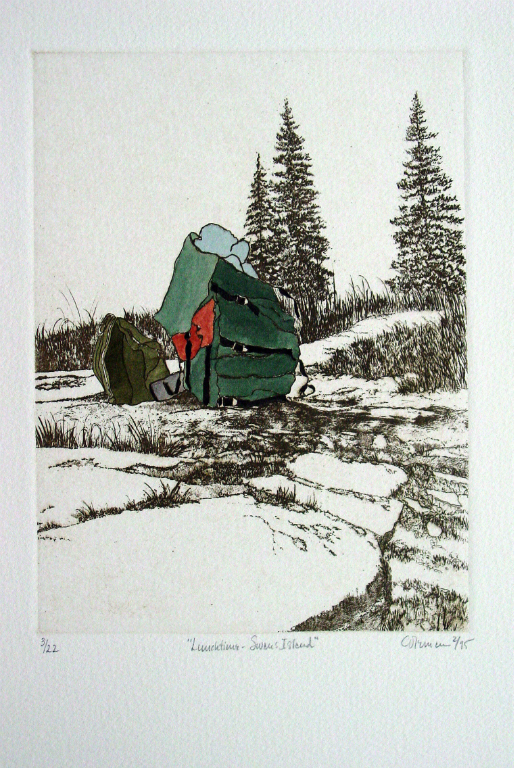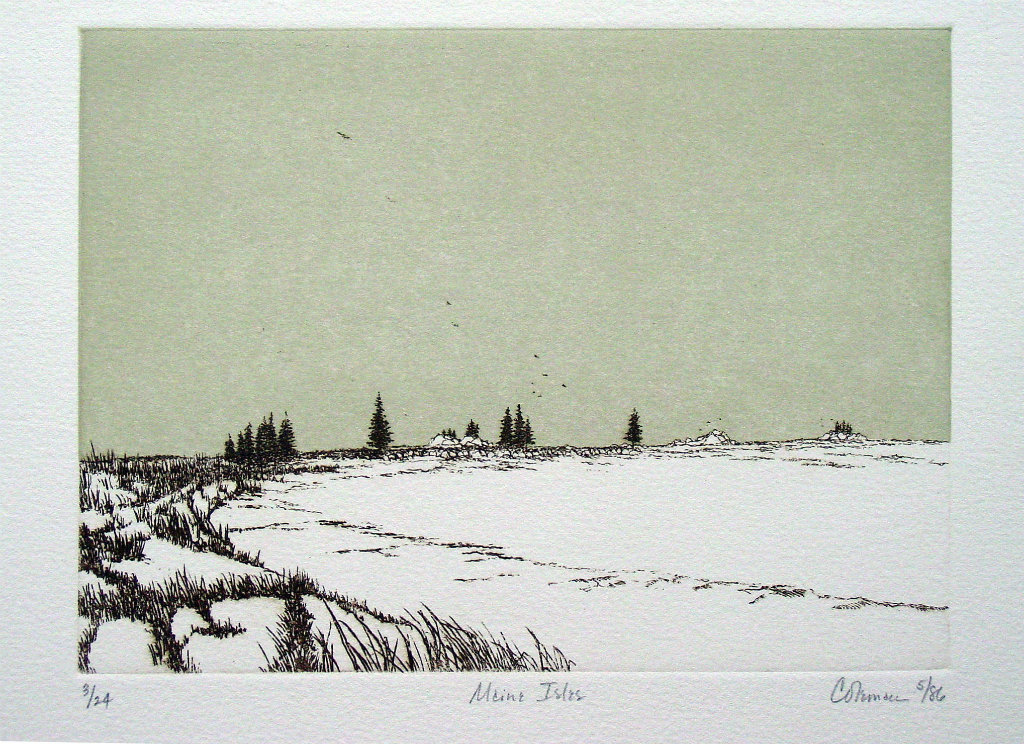 These prints are created using zinc plates on which the images are developed using a variety of drawing and soft ground processes. They are then printed in limited editions. In some instances the skies have been tinted by rolling a tone onto an inked, wiped plate. In other cases, color is added by hand after the prints have dried.