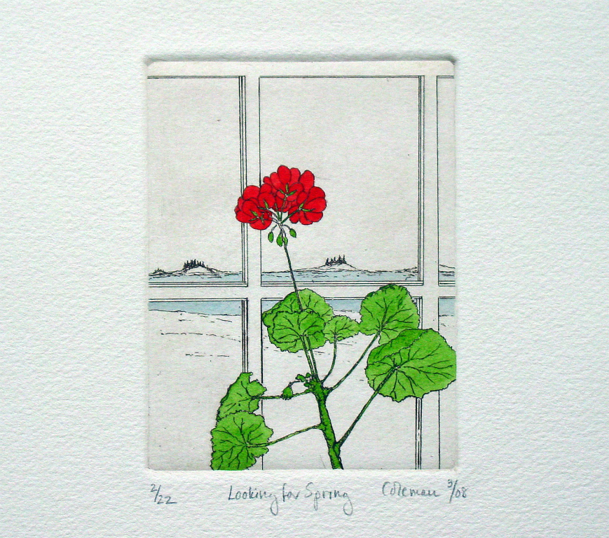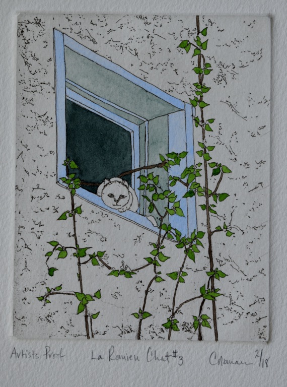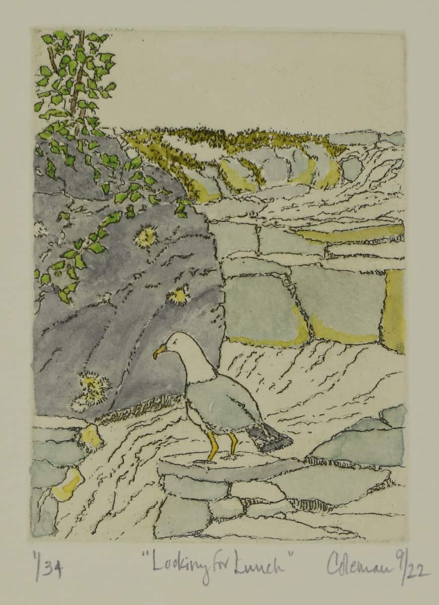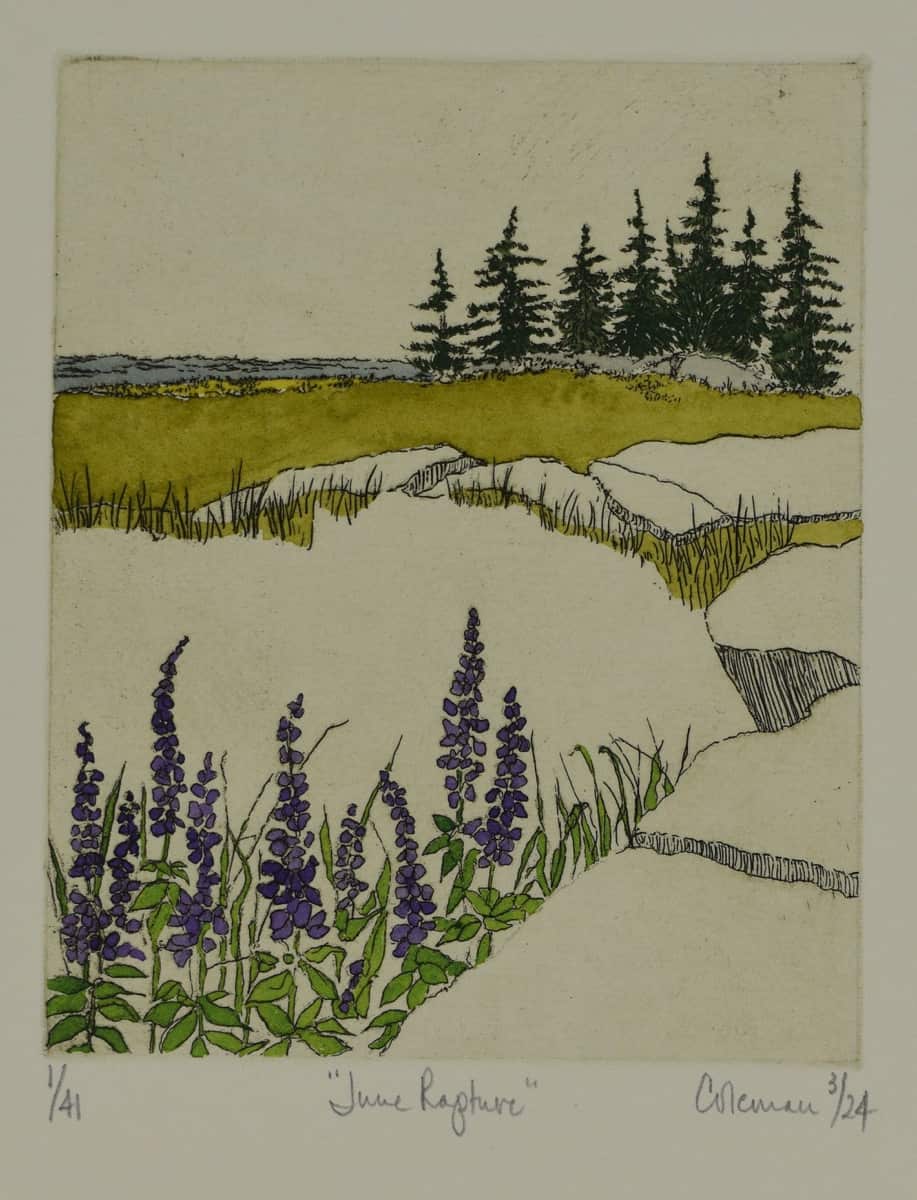 These prints are created using zinc plates on which the images are developed using a variety of drawing and soft ground processes. They are then printed in limited editions. In some instances the skies have been tinted by rolling a tone onto an inked, wiped plate. In other cases, color is added by hand after the prints have dried.