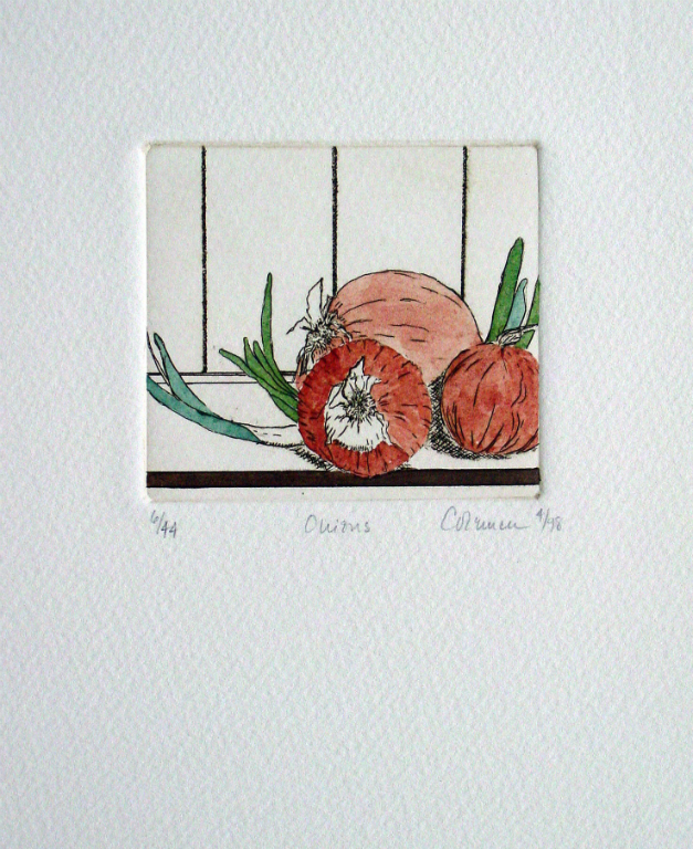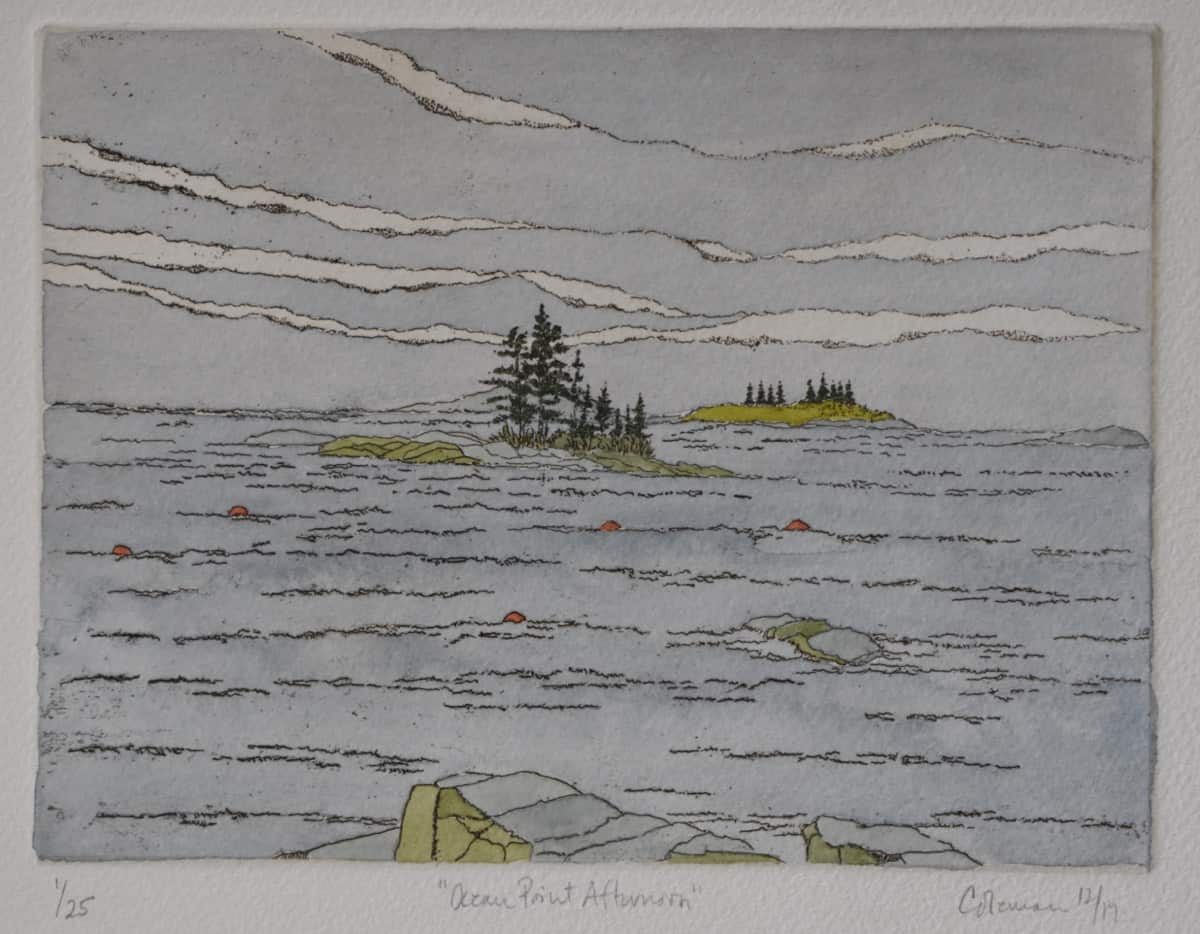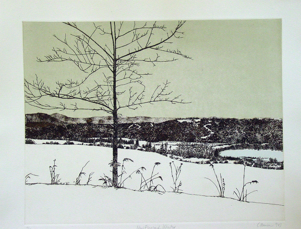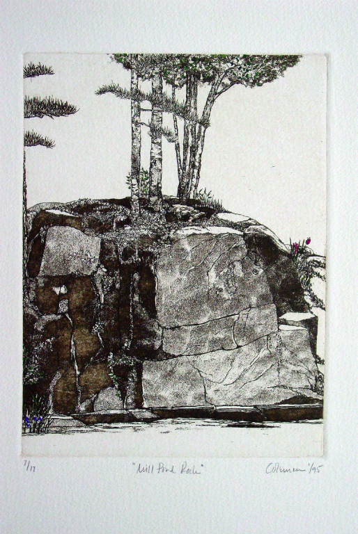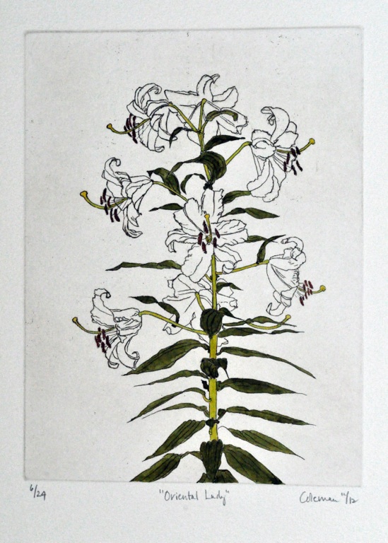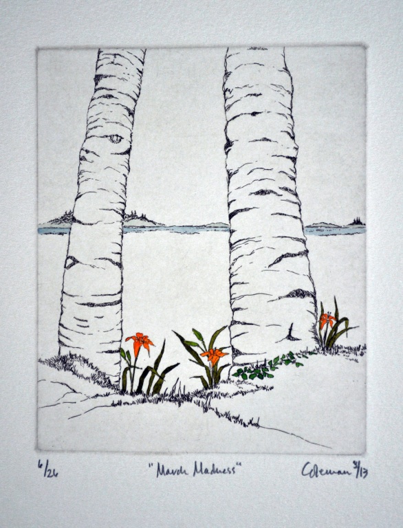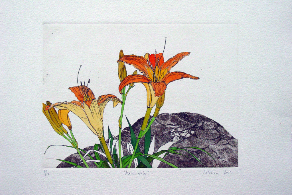 These prints are created using zinc plates on which the images are developed using a variety of drawing and soft ground processes. They are then printed in limited editions. In some instances the skies have been tinted by rolling a tone onto an inked, wiped plate. In other cases, color is added by hand after the prints have dried.