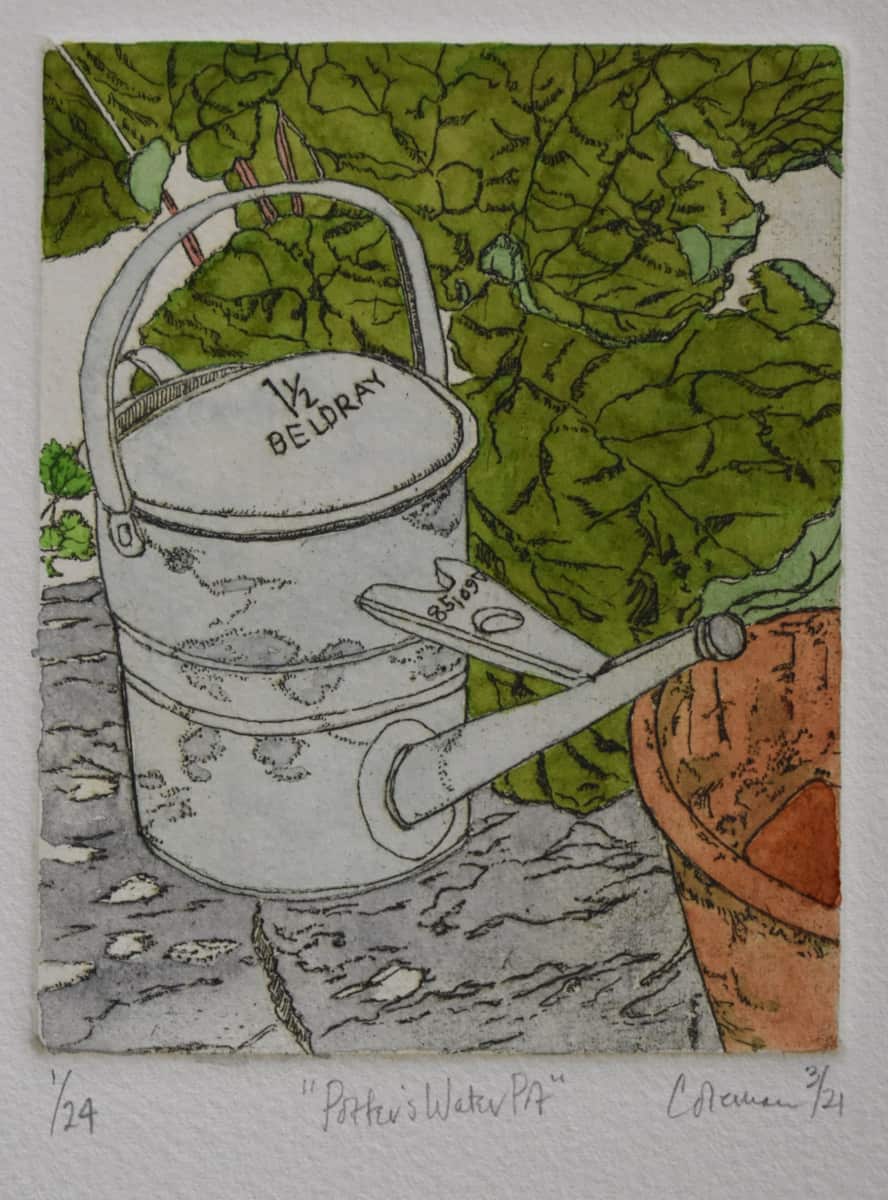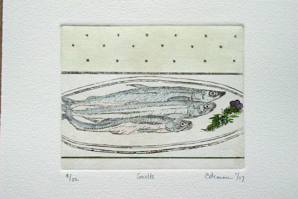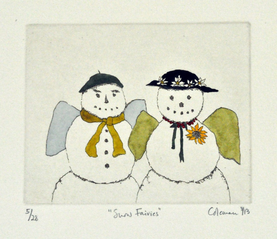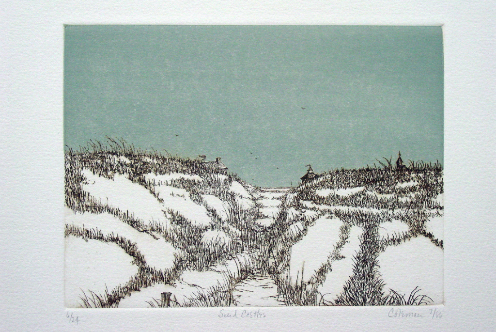 These prints are created using zinc plates on which the images are developed using a variety of drawing and soft ground processes. They are then printed in limited editions. In some instances the skies have been tinted by rolling a tone onto an inked, wiped plate. In other cases, color is added by hand after the prints have dried.