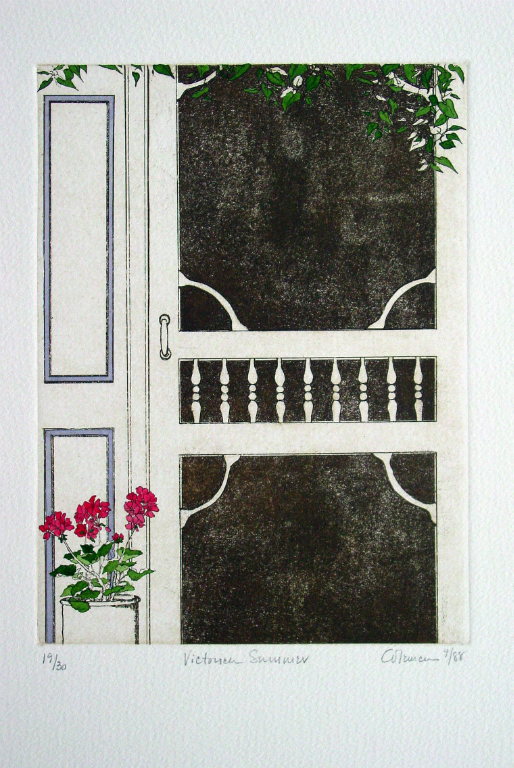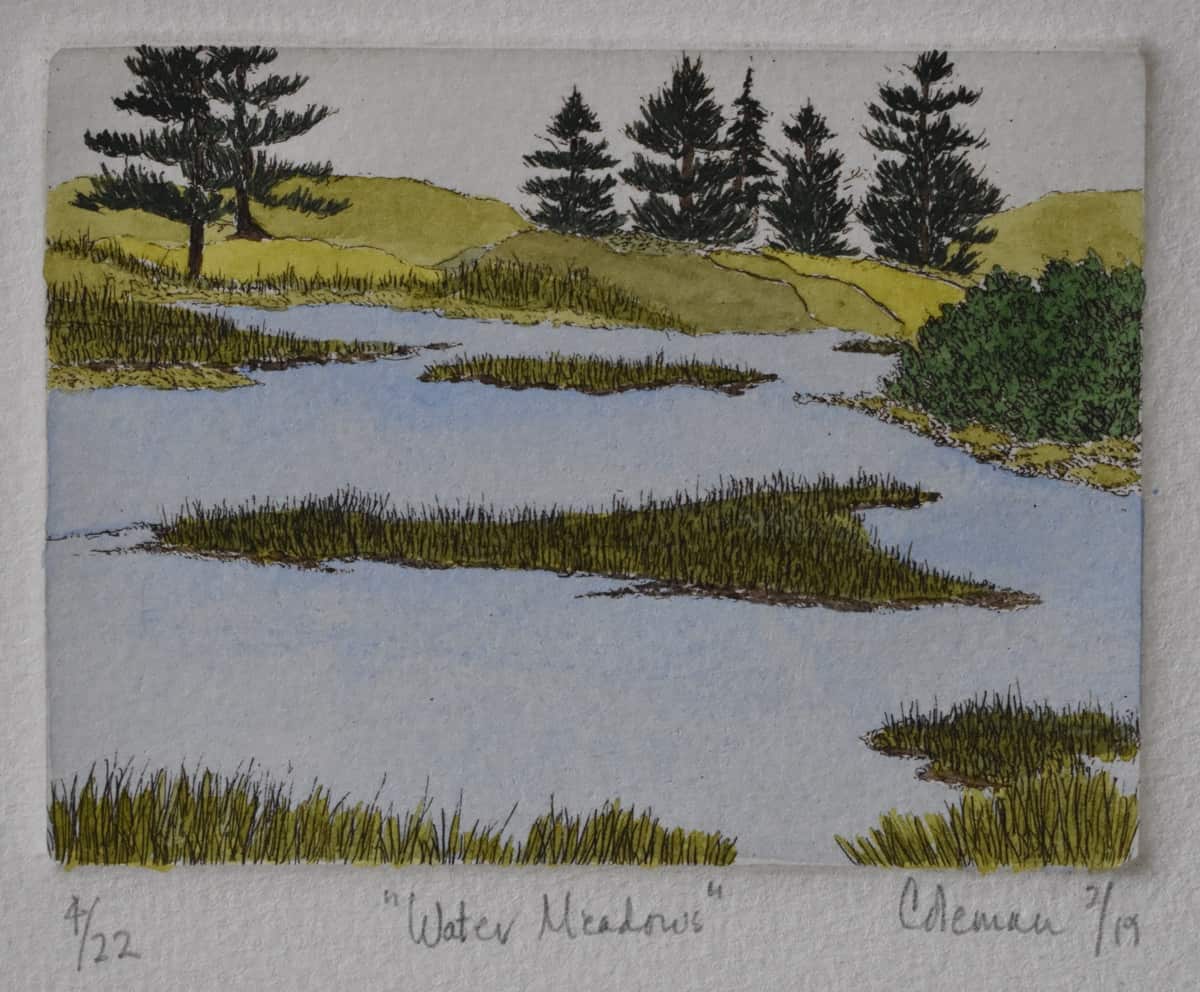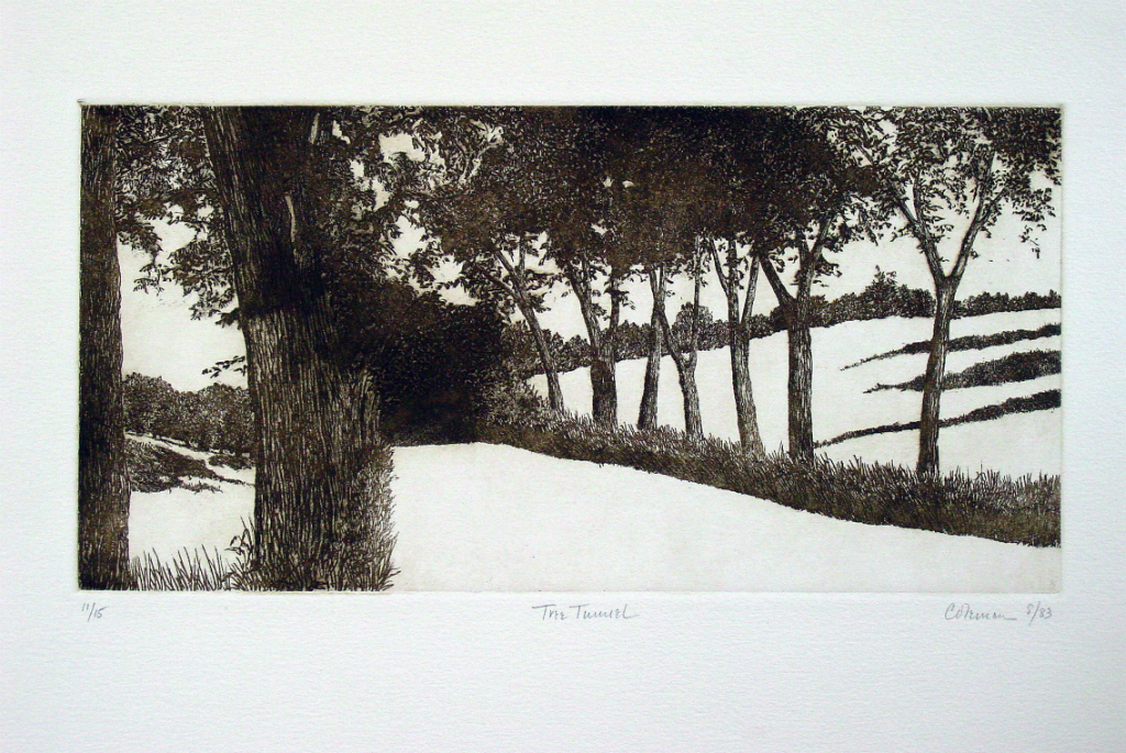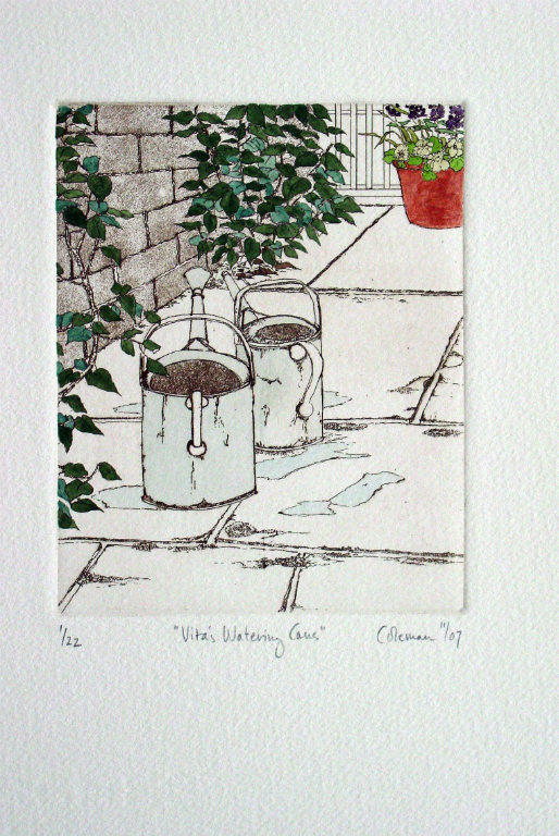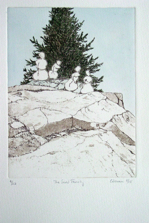 These prints are created using zinc plates on which the images are developed using a variety of drawing and soft ground processes. They are then printed in limited editions. In some instances the skies have been tinted by rolling a tone onto an inked, wiped plate. In other cases, color is added by hand after the prints have dried.