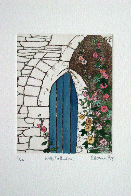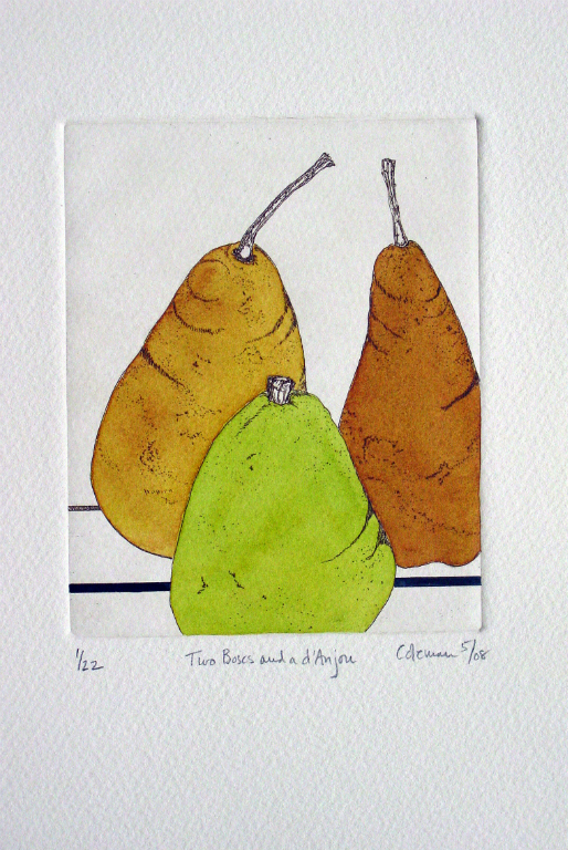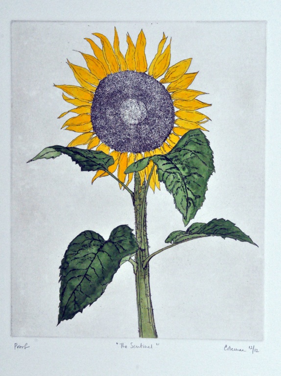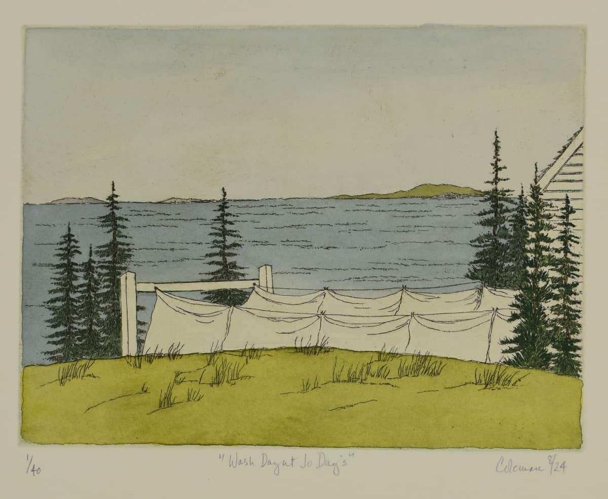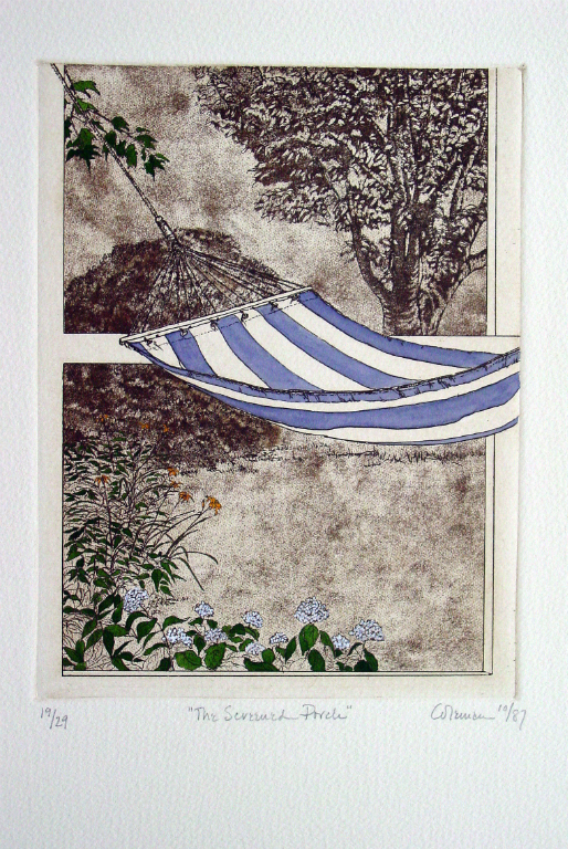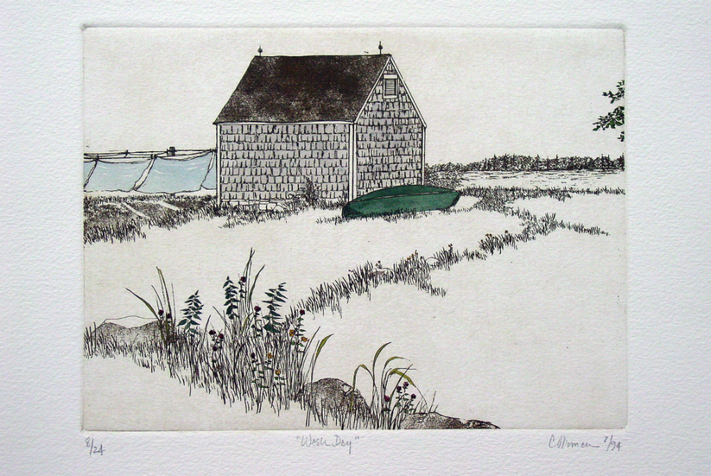 These prints are created using zinc plates on which the images are developed using a variety of drawing and soft ground processes. They are then printed in limited editions. In some instances the skies have been tinted by rolling a tone onto an inked, wiped plate. In other cases, color is added by hand after the prints have dried.