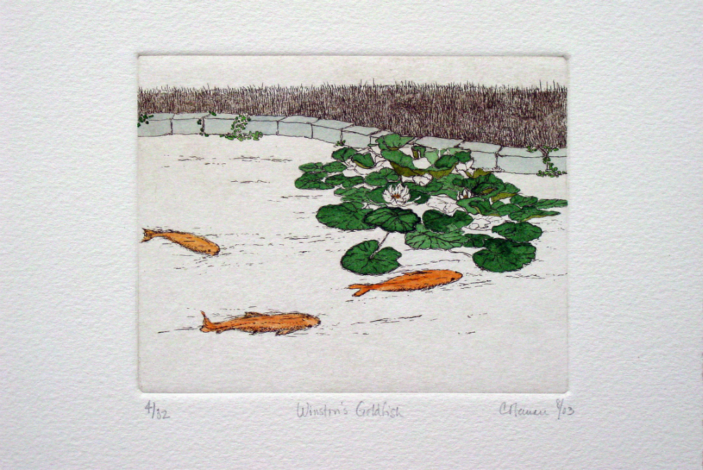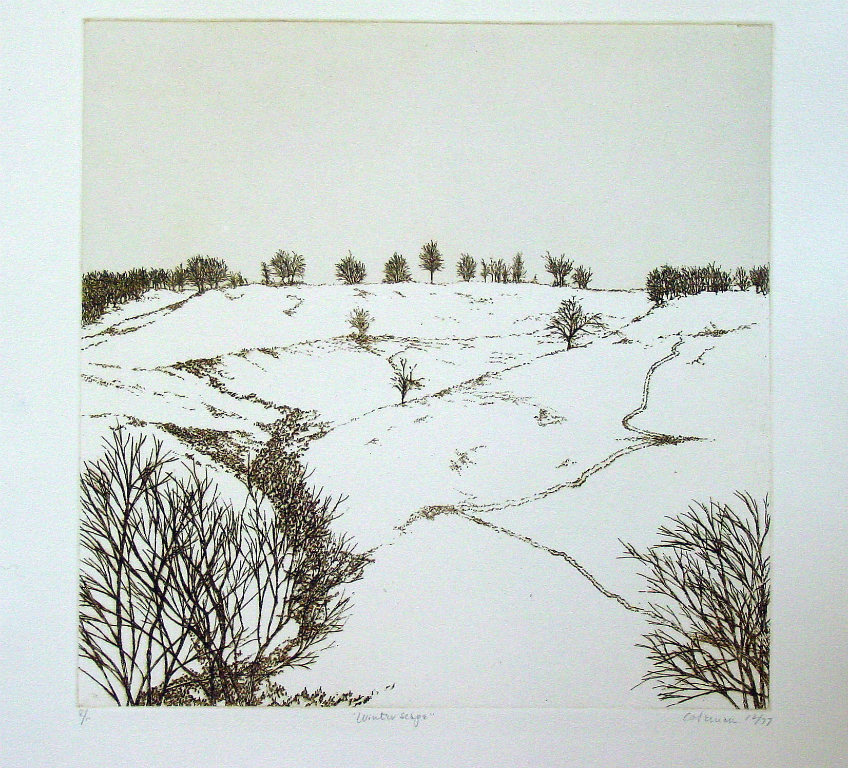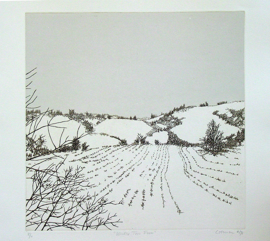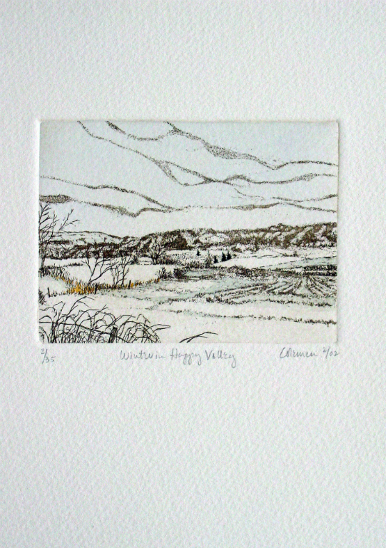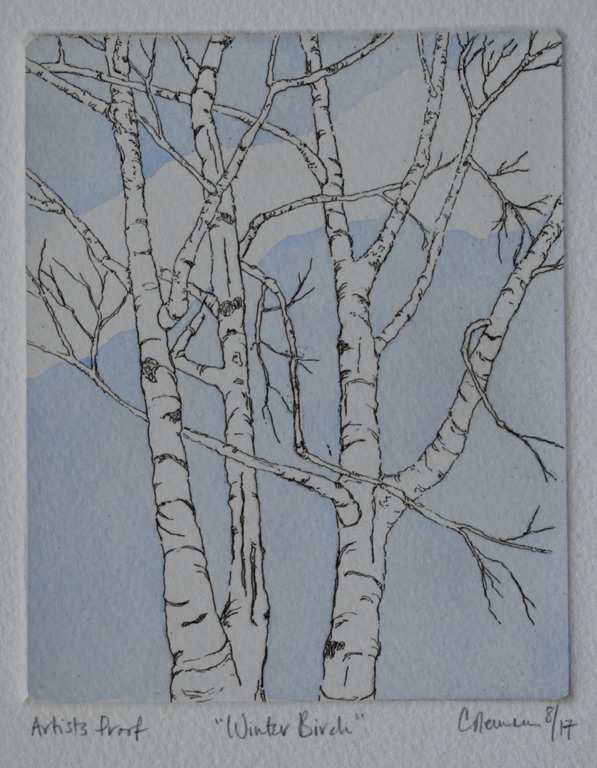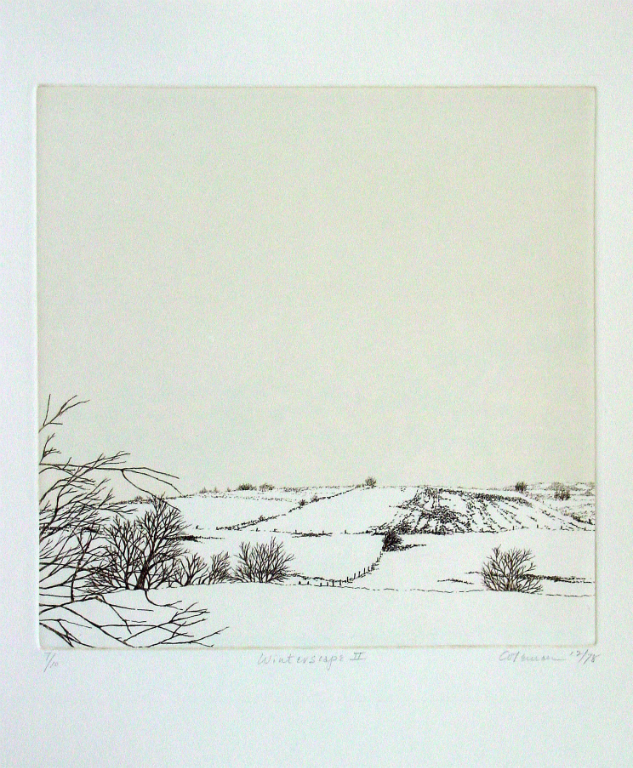 These prints are created using zinc plates on which the images are developed using a variety of drawing and soft ground processes. They are then printed in limited editions. In some instances the skies have been tinted by rolling a tone onto an inked, wiped plate. In other cases, color is added by hand after the prints have dried.
